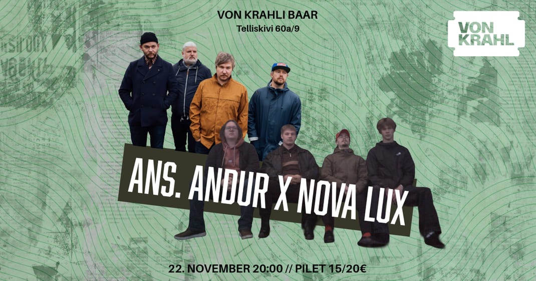 VON KRAHL toob laupäeval, 22. NOVEMBRIL ühele lavale kokku Eesti alternatiivmuusika vanema ja noorema põlvkonna – Paide indie-muusika veterani Ans. Andur ja tänavu debüütalbumiga välja tulnud Tallinna depressiivrokigrupi Nova Lux.