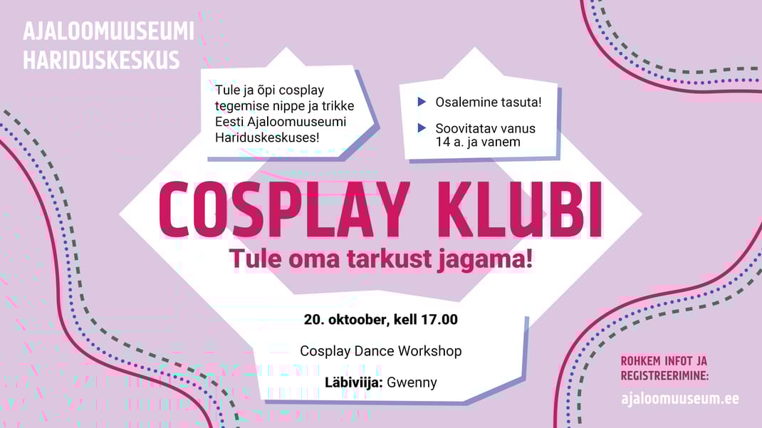 Ajaloomuuseumi hariduskeskuse 𝐂𝐨𝐬𝐩𝐥𝐚𝐲 𝐤𝐥𝐮𝐛𝐢 jätkab sügishooajal uute kohtumistega! Esimene kohtumine on tantsuteemaline ja toimub 𝟐𝟎. 𝐨𝐤𝐭𝐨𝐨𝐛𝐫𝐢𝐥 𝐤𝐞𝐥𝐥 𝟏𝟕.𝟎𝟎-𝟏𝟖.𝟑𝟎. Kohtumist viib läbi cosplayer 𝐆𝐰𝐞𝐧𝐧𝐲 https://www.instagram.com/simkaart_._/