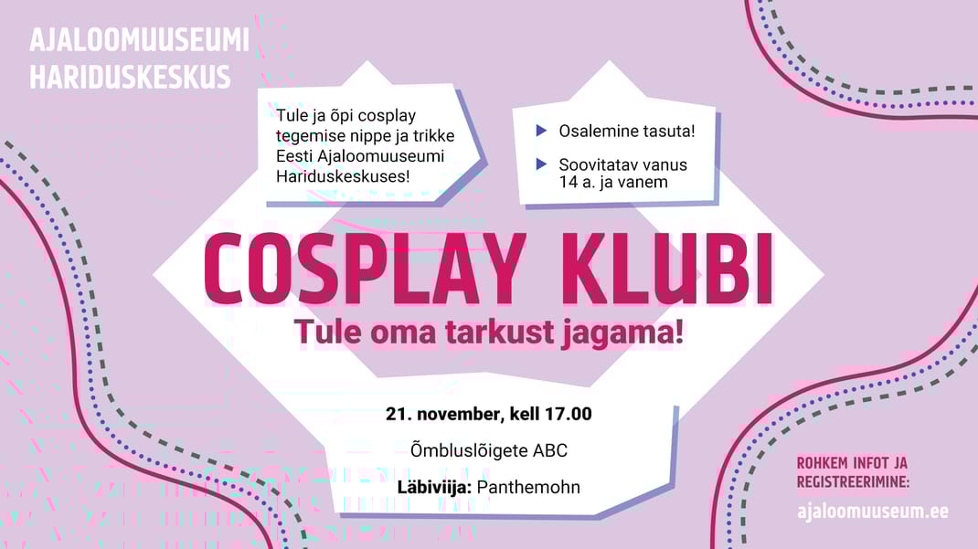 Ajaloomuuseumi hariduskeskuse 𝐂𝐨𝐬𝐩𝐥𝐚𝐲 𝐤𝐥𝐮𝐛𝐢 sügishooaja teine kohtumine toimub reedel, 𝟐𝟏. 𝐧𝐨𝐯𝐞𝐦𝐛𝐫𝐢𝐥kell 17.00-18.30 ja on õ𝐦𝐛𝐥𝐮𝐬𝐥õ𝐢𝐠𝐞𝐭𝐞 teemal. Töötuba viib läbi cosplayer 𝐏𝐚𝐧𝐭𝐡𝐞𝐦𝐨𝐡𝐧. https://www.instagram.com/panthemohn/