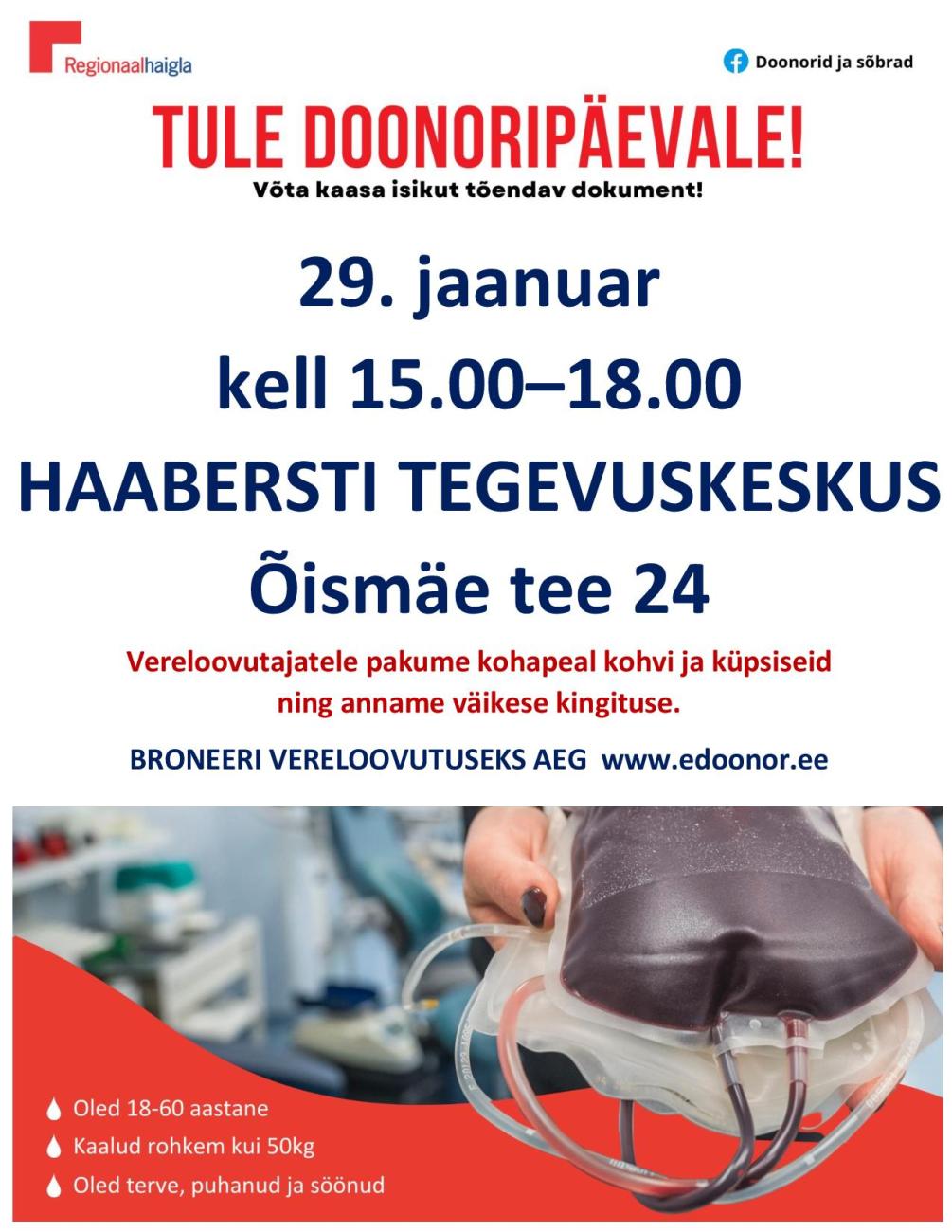 Kutsume kõiki Haabersti elanikke osalema vereloovutuspäeval ja tegema heateo, mis võib päästa kellegi elu. Iga annetatud veredoos on hindamatu väärtusega.