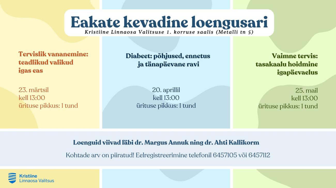 Esimene kevadine loeng toimub 23. märtsil kell 13.00 Kristiine Linnaosa Valitsuse 1. korruse saalis (Metalli tn 5)