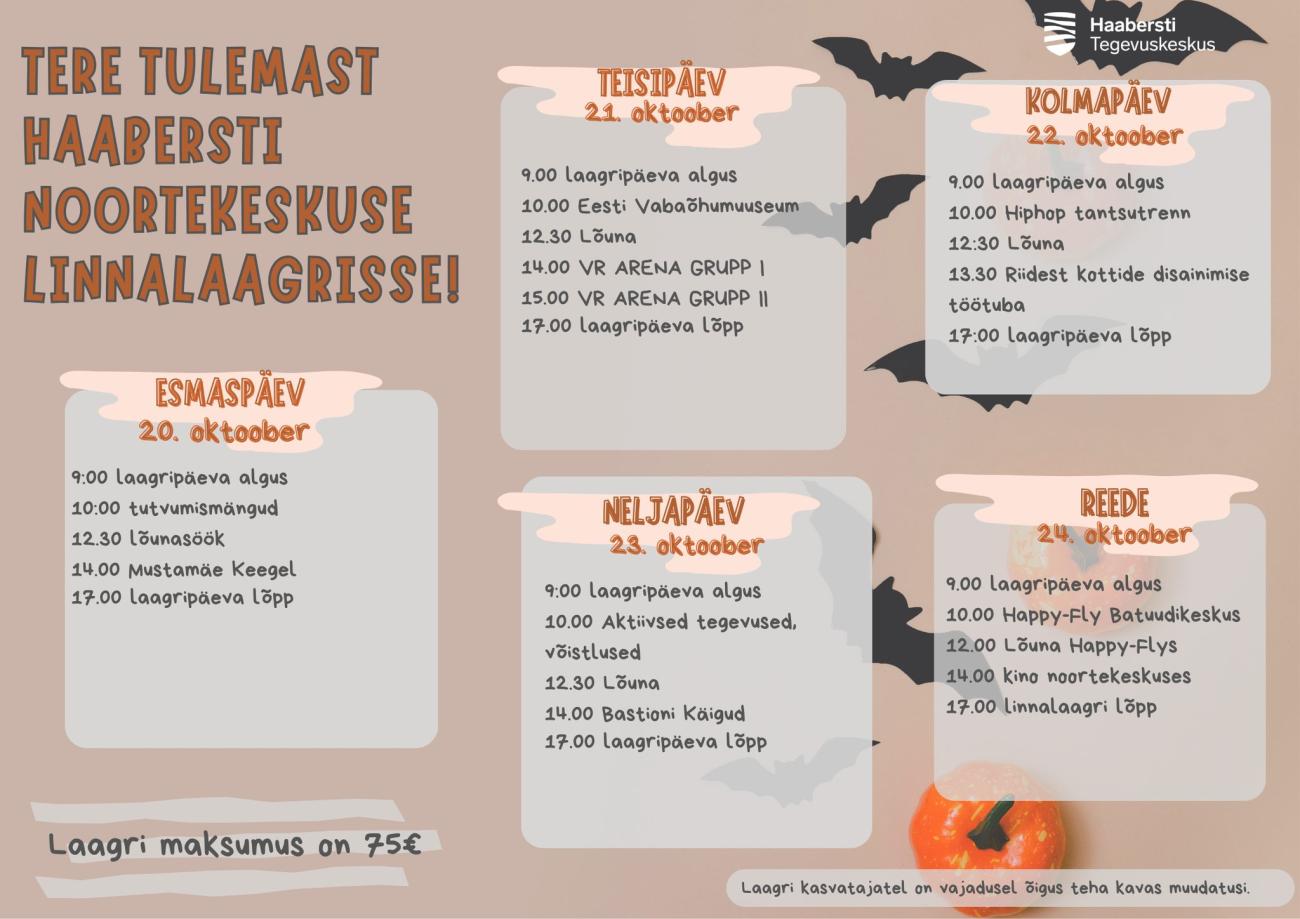 Haabersti noortekeskuse linnalaager on suunatud 7-12aastastele noortele. Linnalaagris toimuvad põnevad väljasõidud ja aktiivsed/käelised tegevused noortekeskuses.
