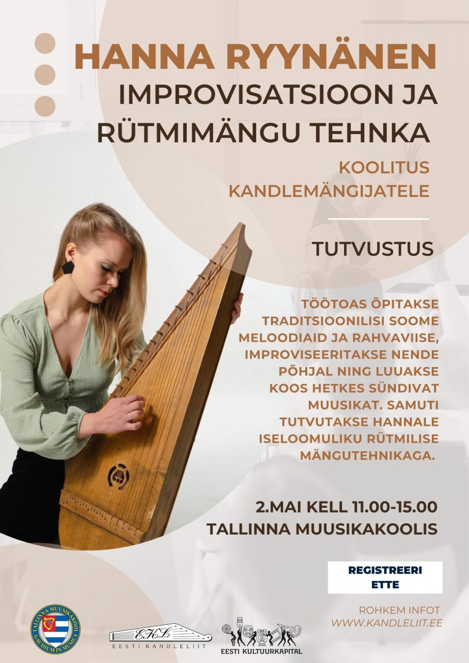 Kandlemängija Hanna Ryynäneni koolitusel on kõigil võimalus otsida oma pillil kõikvõimalikke tämbreid ning tutvuda mitmete erinevate ja üllatavate mängustiilidega. Hanna enda pill on 21-keelne Saarijärve kannel, aga kuidas kõlab kromaatiline kannel, kui seda mängitakse puupulgaga ja kas see sobib ka perkussiivseks mänguks? Milliseid võimalusi loovad uued mängutehnilised lahendused juba tuttavale ja traditsioonilisele mängustiilile?