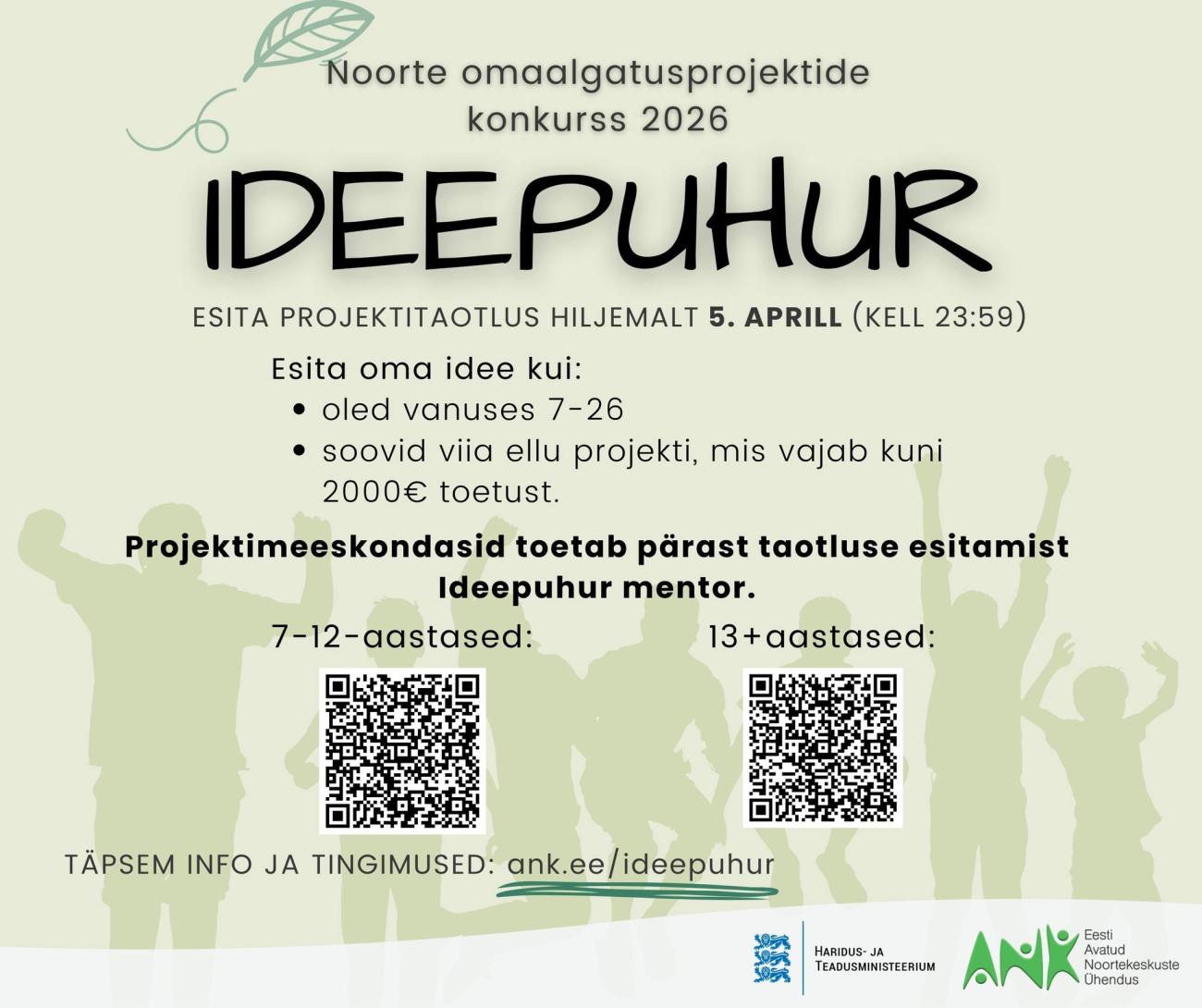 Hea noor! Sul on äge idee, mis võiks maailma muuta? Või sinu kogukonda, kodukohta või noortekeskust? Ideepuhur 2026 ootab 7–26-aastaste noorte algatusi! Kui Sul on idee, mille elluviimiseks on vaja kuni 2000 eurot, siis esita oma projektiidee hiljemalt 5. aprilliks!
