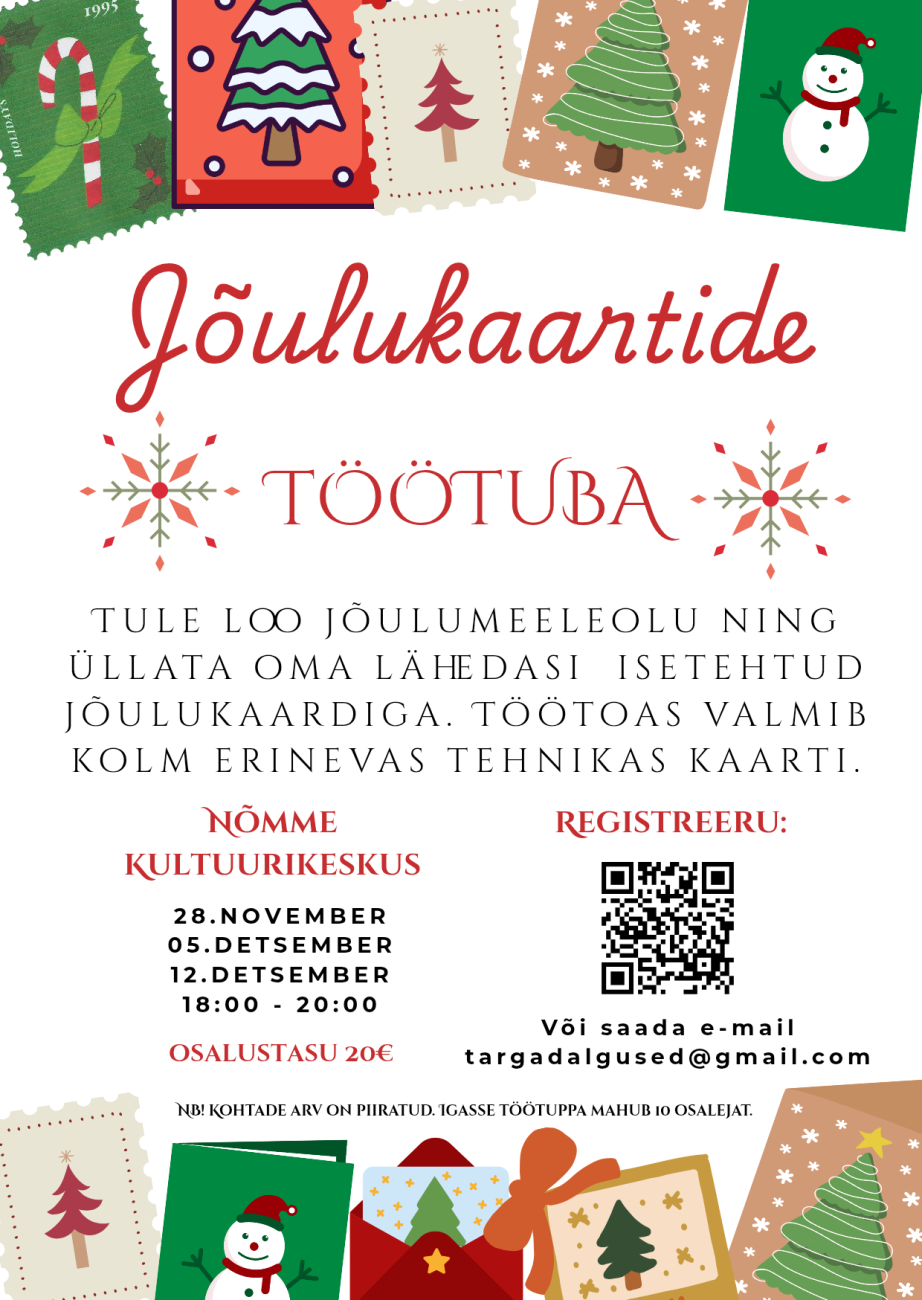 Töötuba sobib kõigile, kes soovivad pühade ajal oma lähedasi rõõmustada isetehtud jõulukaardiga ja võtta endale aega loovaks tegutsemiseks.