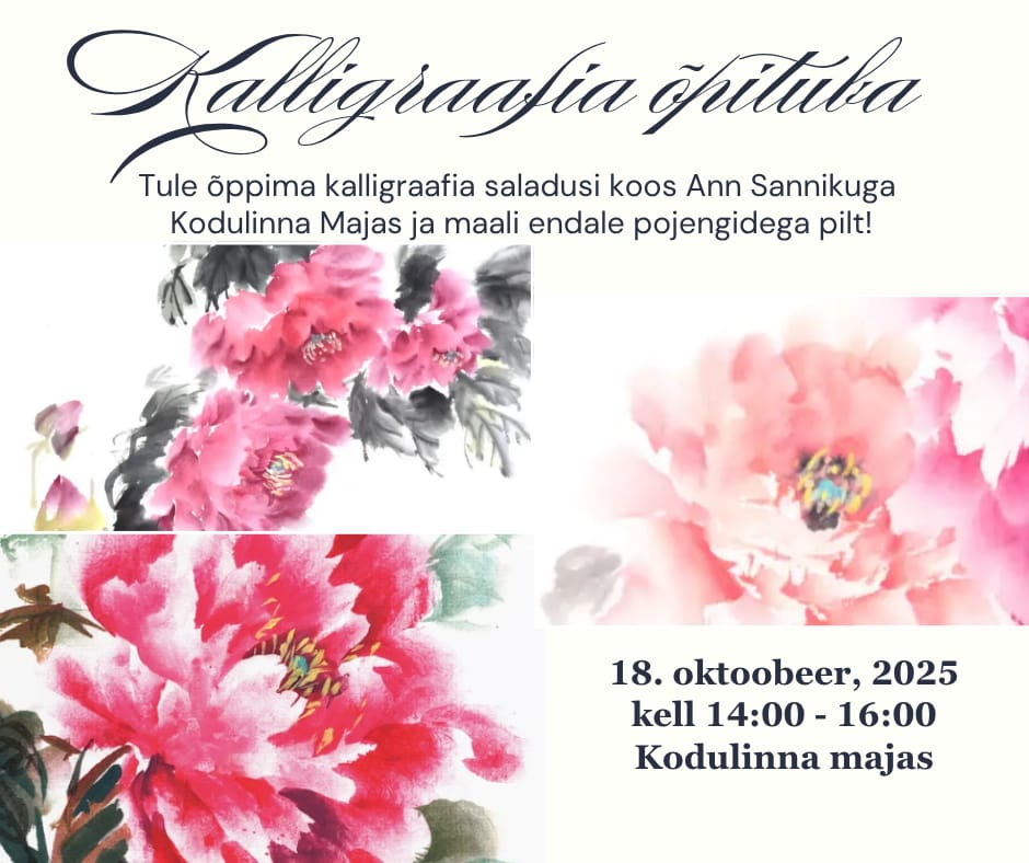 Liitu meiega 18. oktoobril 2025 kell 14:00 - 16:00 Kodulinna Majas, kus Ann Sannik, kogenud kalligraafia õpetaja ja kunstnik, juhendab sind läbi praktiliste harjutuste ja inspireerivate näidete, et suudaksid ise joonistada kalligraafia tehnikaga pojenge. See koolitus sobib nii algajatele kui ka neile, kes soovivad oma oskusi täiustada.