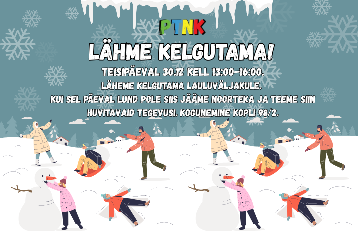 Läheme noortega lauluväljakule kelgutama, kus noored saavad nautida talverõõmu ja veeta koos aktiivselt aega. Kui õues lund pole, siis jääme noortekeskusesse ja teeme aktiivseid ja mängulisi tegevusi.