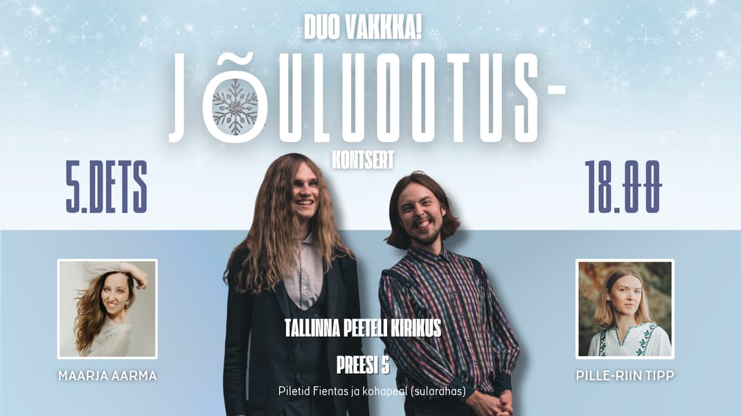 Duo Vakkka! kutsub Sind ühele meditatiivsele ja mõnusale jõuluootuse kontserdile, kus kohtuvad vioolal Kristjan Kannukene ja saksofonil Karl Tipp, kelle instrumentaali helidele lisavad mahedust vokaalidel Maarja Aarma ja Pille-Riin Tipp.