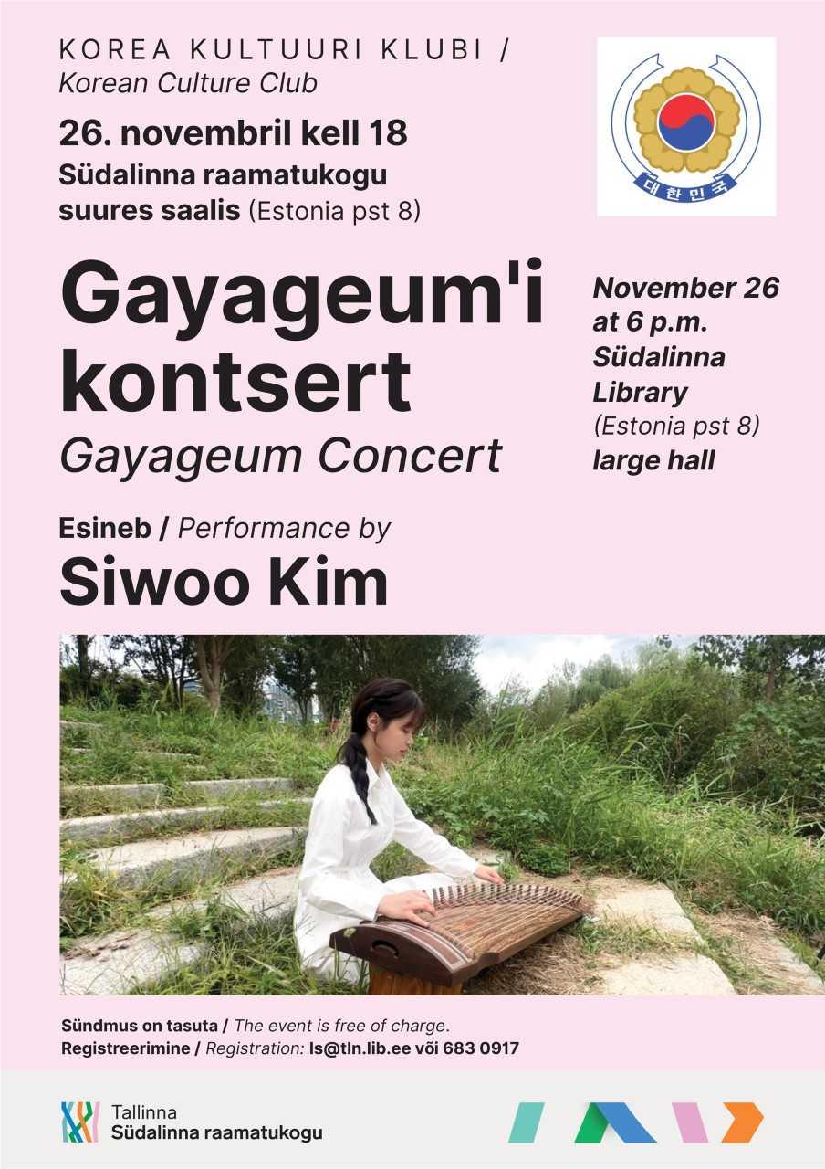 Korea Vabariigi Saatkond Tallinnas ning Südalinna Raamatukogu Korea kultuuri klubi kutsuvad korea rahvuspilli gayageumi kontserdile 26. novembril kell 18 Tallinnas Südalinna Raamatukogu suures saalis. Esineb Siwoo Kim. Kontsert on tasuta! Reserveeri endale istekoht: ls@tln.lib.ee või tel. 6830917