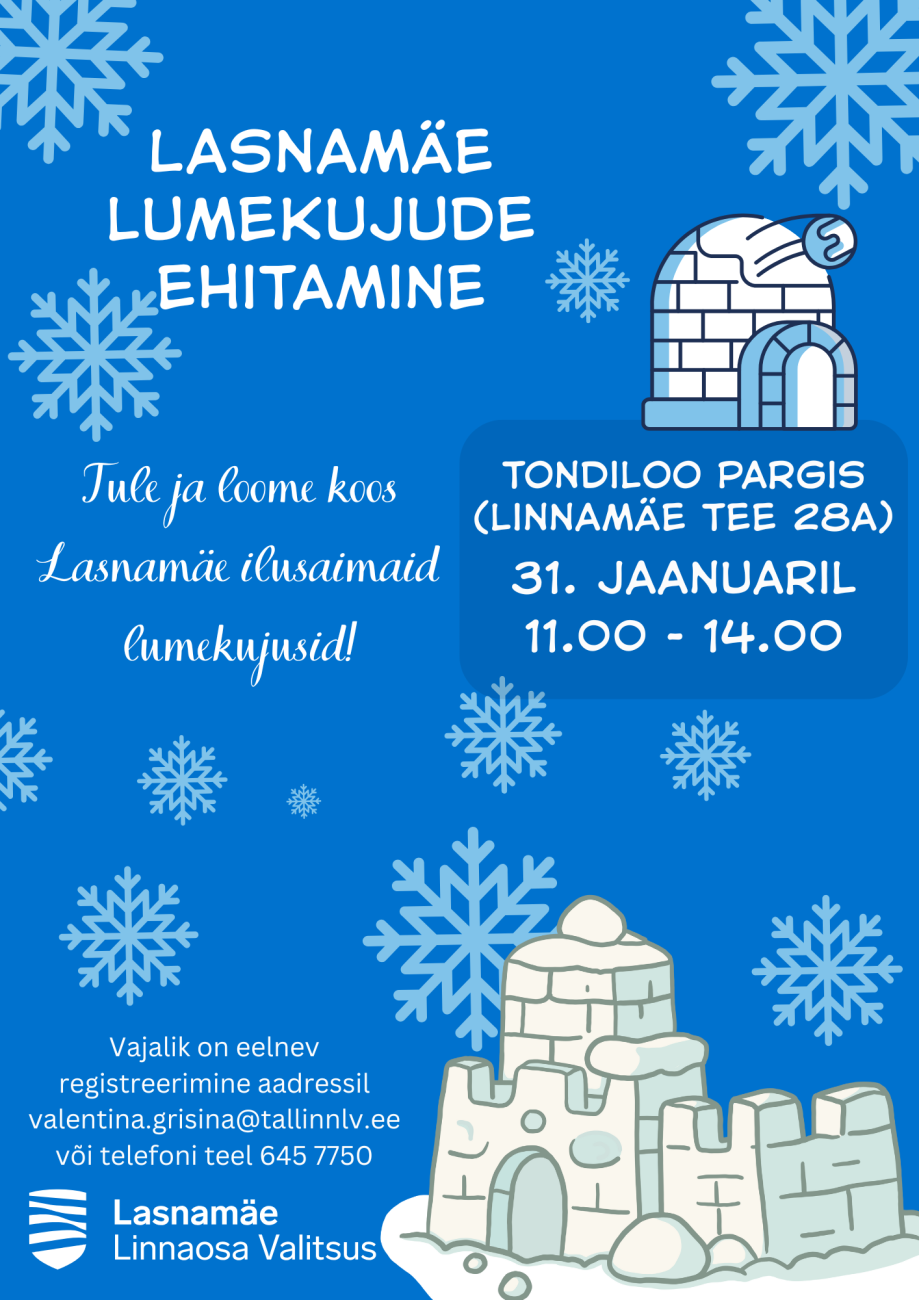 Et lumekujude ehitamine kulgeks sujuvalt ning kõigile jätkuks nii lund kui ka töövahendeid, tuleb oma osalemissoov eelnevalt registreerida e-posti aadressil valentina.grisina@tallinnlv.ee või telefonil 645 7750. Registreerimine on avatud 29. jaanuarini.