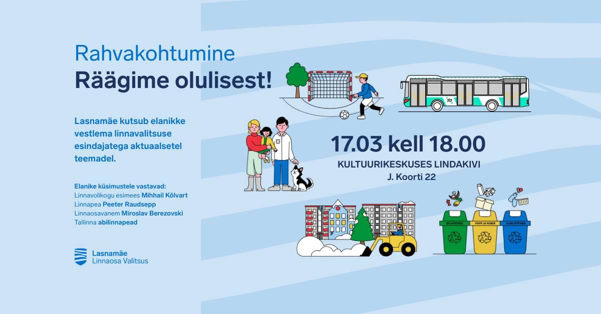 Teisipäeval, 17. märtsil toimub Kultuurikeskuses Lindakivi (J. Koorti tn 22) rahvakohtumine, kus Lasnamäe elanikel on võimalus arutada linna ja linnaosa arenguküsimusi otse Tallinna juhtide ja esindajatega.