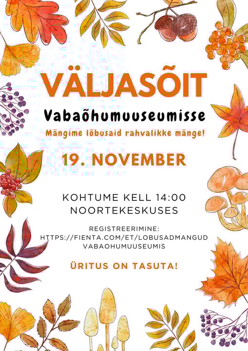 Stardime 14:00 Harkujärve noortekeskusest ning jõuame tagasi hiljemalt 18:00. NB! Liigume ühistranspordiga ja kohad on piiratud!