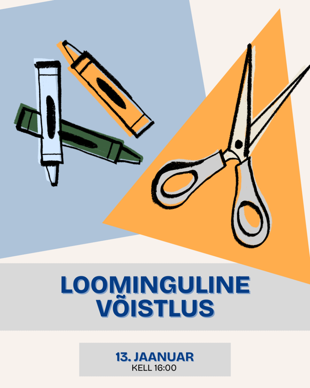 13. Jaanuaril kell 16.00 toimub Kristiine noortekeskuses esimene loominguline võistlus. Anname ette teema ning sinu kasutuses on erinevad materjalid. Joonista, meisterda, ehita, kombineeri - tee just nii, nagu sina tunned, et teemat kõige paremini väljendada. Õigeid ega valesid lahendusi ei ole, oluline on julgus ja loovus. Ootamas on põnev protsess, hea seltskond ja auhinnad osalejatele!