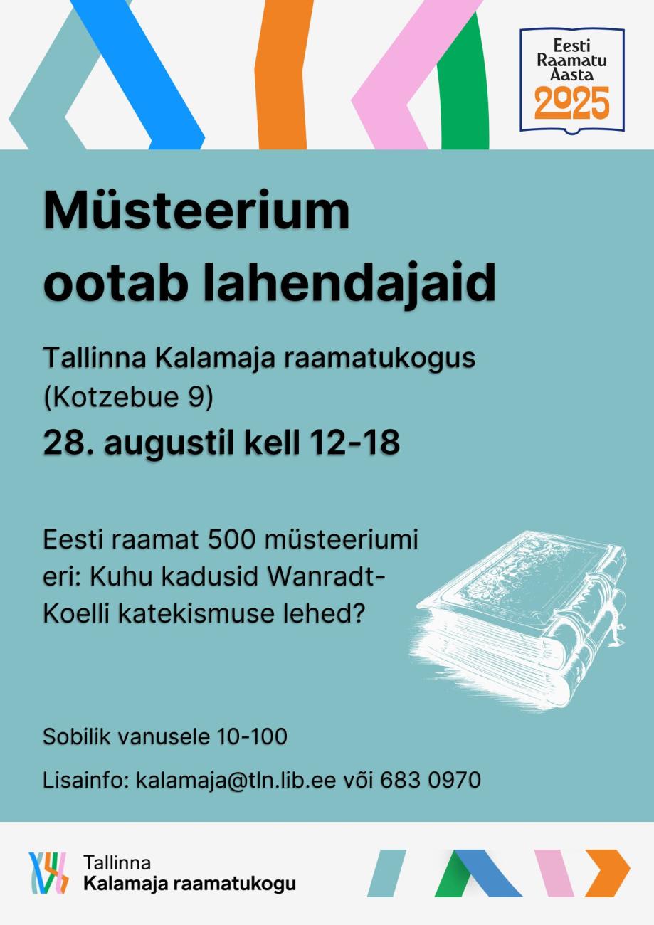 Tallinna Kalamaja raamatukogu (Kotzebue 9) ootab vastu kultuuriööd, 28ndal augustil ajavahemikus kell 12-18 ,lahendama Eesti raamat 500 müsteeriumi eri: Kuhu kadusid Wanradt-Koelli katekismuse lehed?