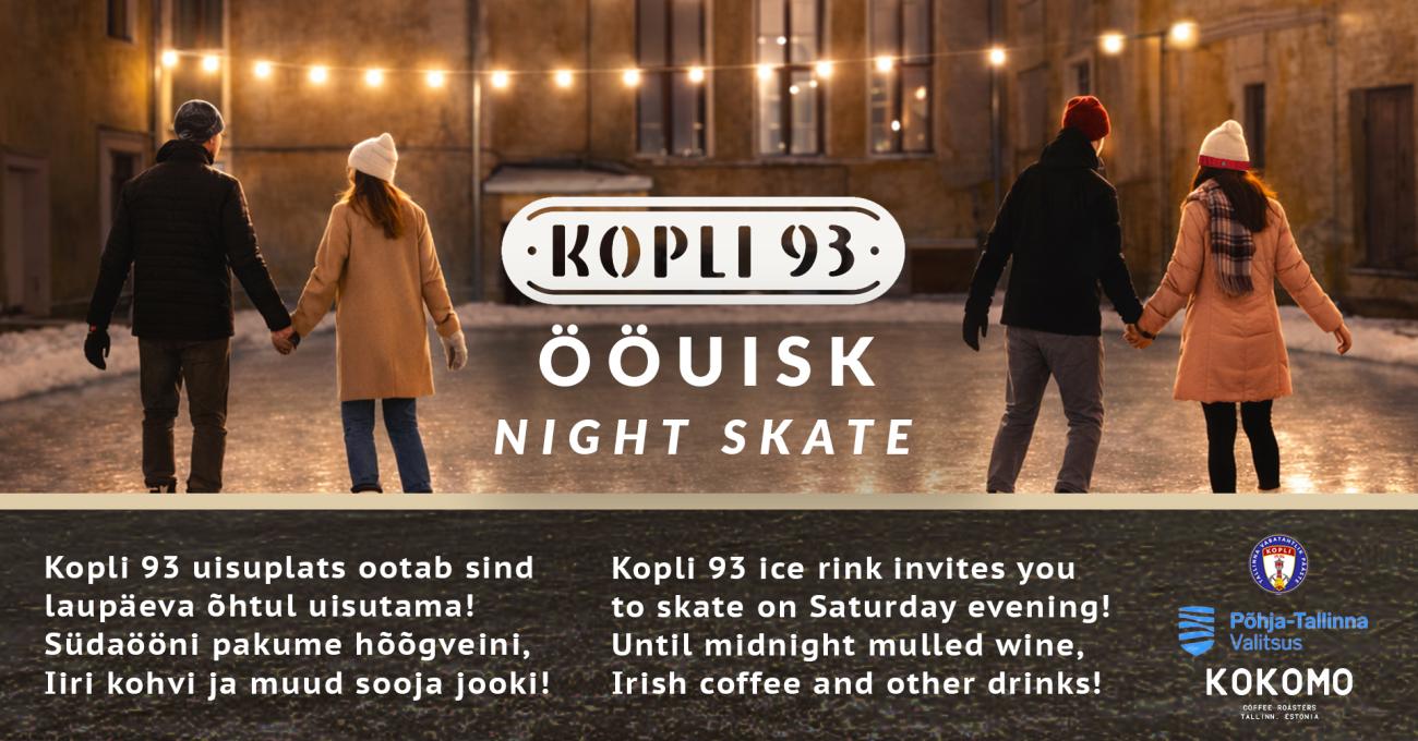 Kopli 93 öine uisuplats on seekord avatud eelkõige täiskasvanutele - tule üksi, paarilise või terve seltskonnaga. Lisaks hõõgveinile pakume kohvikoda Kokomo poolt Iiri kohvi ja muid soojendavaid jooke.