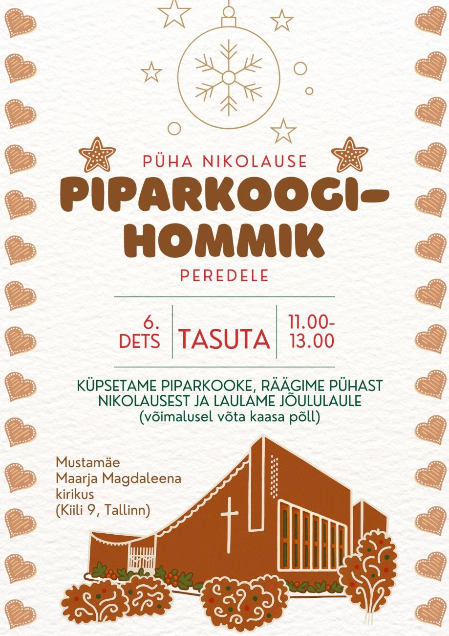 Laupäeval, 6. detsembril kell 11-13.00 saab Mustamäe Maarja Magdaleena kirikus (Kiili 9, Tallinn) teha piparkooke , kuulata lugu Pühast Nikolausest ehk esimesest Jõuluvanast  ning üheskoos laulda jõululaule.