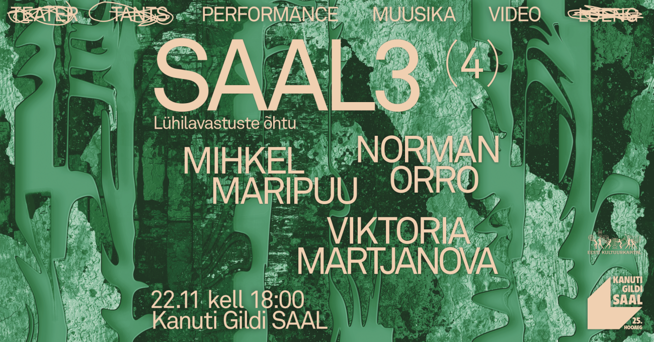 SAAL3 on lühilavastuste formaat, mis on loodud, et anda võimalus kunstnikele katsetusteks, proovimisteks, eksimisteks ja õnnestumisteks. SAAL3 leiab aset ainult ühel õhtul – mis teeb sündmusest korraga nii esietenduse kui ka finissage’i. SAAL3 vol 4 kunstnikeks on Viktoria Martjanova, Mihkel Maripuu ja Norman Orro.