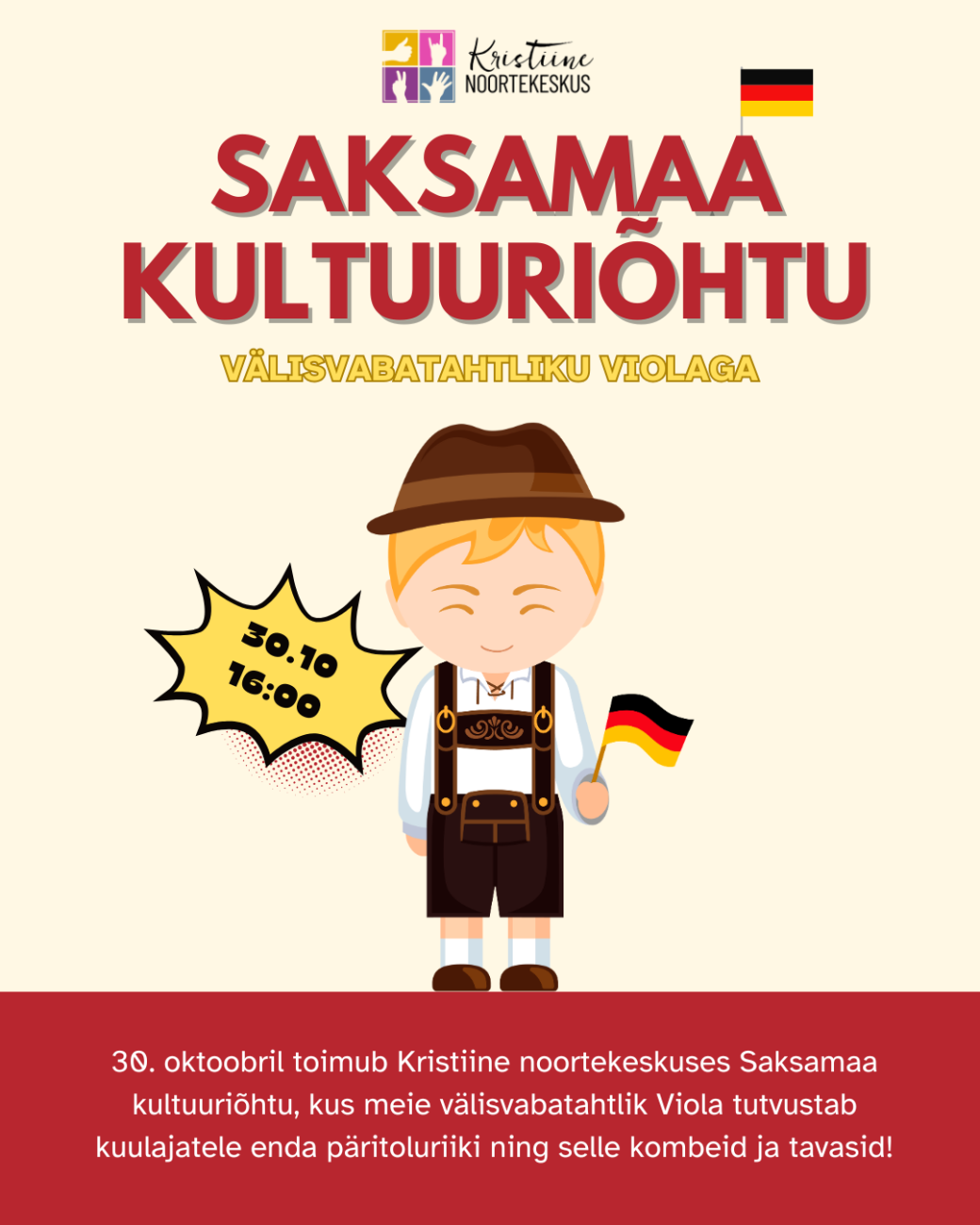 30. oktoobril kell 16.00 toimub Kristiine noortekeskuses Saksamaa kultuuriõhtu, kus välisvabatahtlik Viola tutvustab kuulajatele enda päritoluriiki ning selle kombeid ja tavasid. Kavas on esitlus, Kahoot ja üheskoos toidu tegemine. Oodatud on kõik!