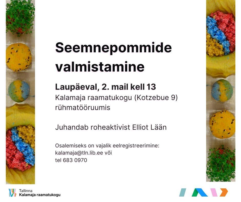 Kui soovid linna (ja üleüldse) looduse liigirikkusesse panustada ja olla ekstra kindel, et sinu istutatud seemned kasvama läheksid, siis seemnepomm on lahendus. Tule 2. mail kell 13.00 Kalamaja raamatukogusse, kus roheaktivist Elliot Lään õpetab valmistama maagilisi "seemnepomme".