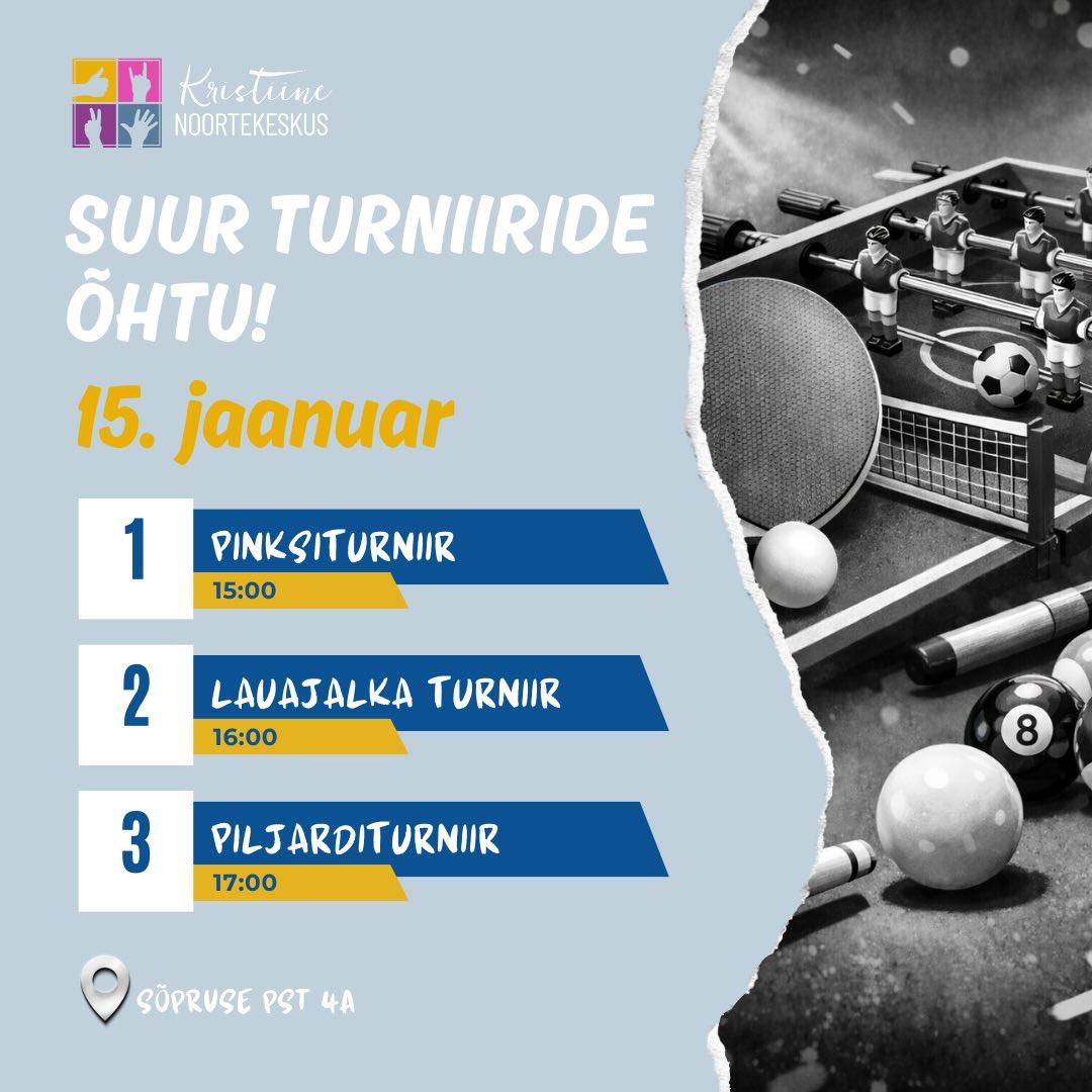 15. jaanuaril toimuvad Kristiine noortekeskuses (Sõpruse pst 4a) kolm turniiri pinksis, lauajalgpallis ja piljardis. Iga mängu arvestus toimub eraldi, kuid lisaks selgub ka kolme mängu koondvõitja.