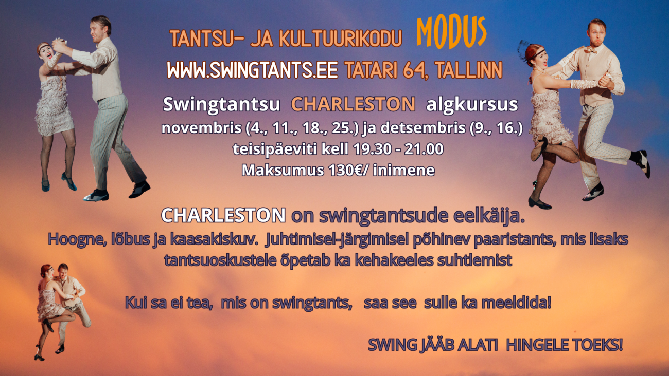 Algkursus toimub teisipäeviti 4., 11., 18. ja 25.novembril ning 9. ja 16.detsembril, lõppedes charlestoni peoga.