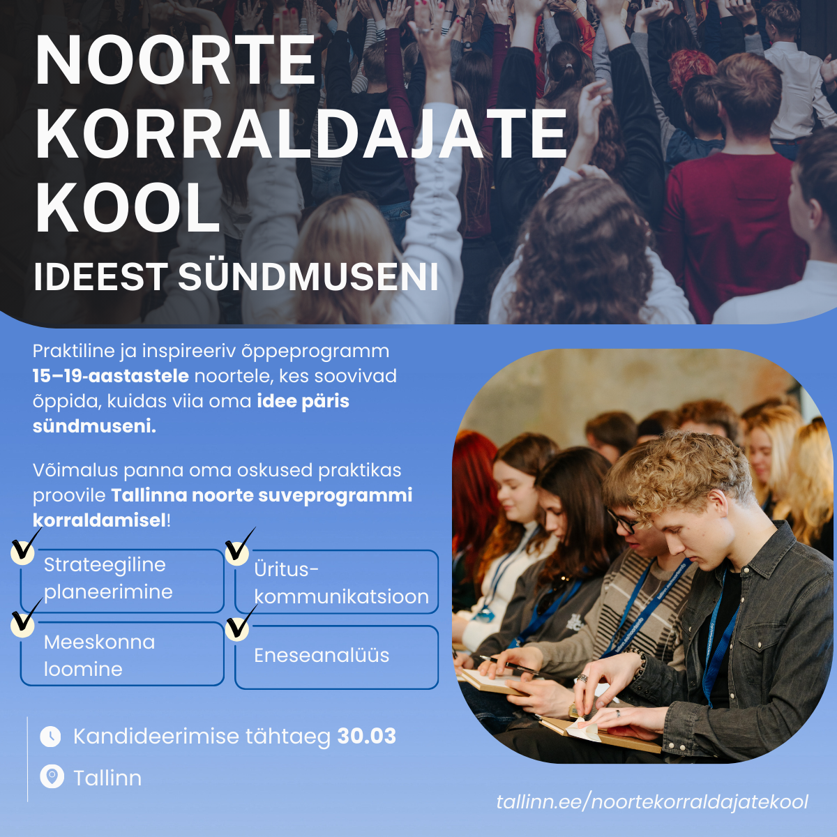 Tallinna noorte korraldajate kool on praktiline ja inspireeriv õppeprogramm 15–19‑aastastele noortele, kes soovivad õppida, kuidas viia oma idee päris sündmuseni. Programmis osalejad saavad tuge meeskonnatöös, sündmuse planeerimises, kommunikatsioonis ning arenguprotsessi analüüsimises. Kõigile korralduskooli läbijatele väljastame tunnistuse läbitud teemadest ning pakume võimaluse panna oma oskused praktikas proovile Tallinna noorte suveprogrammi korraldamisel.