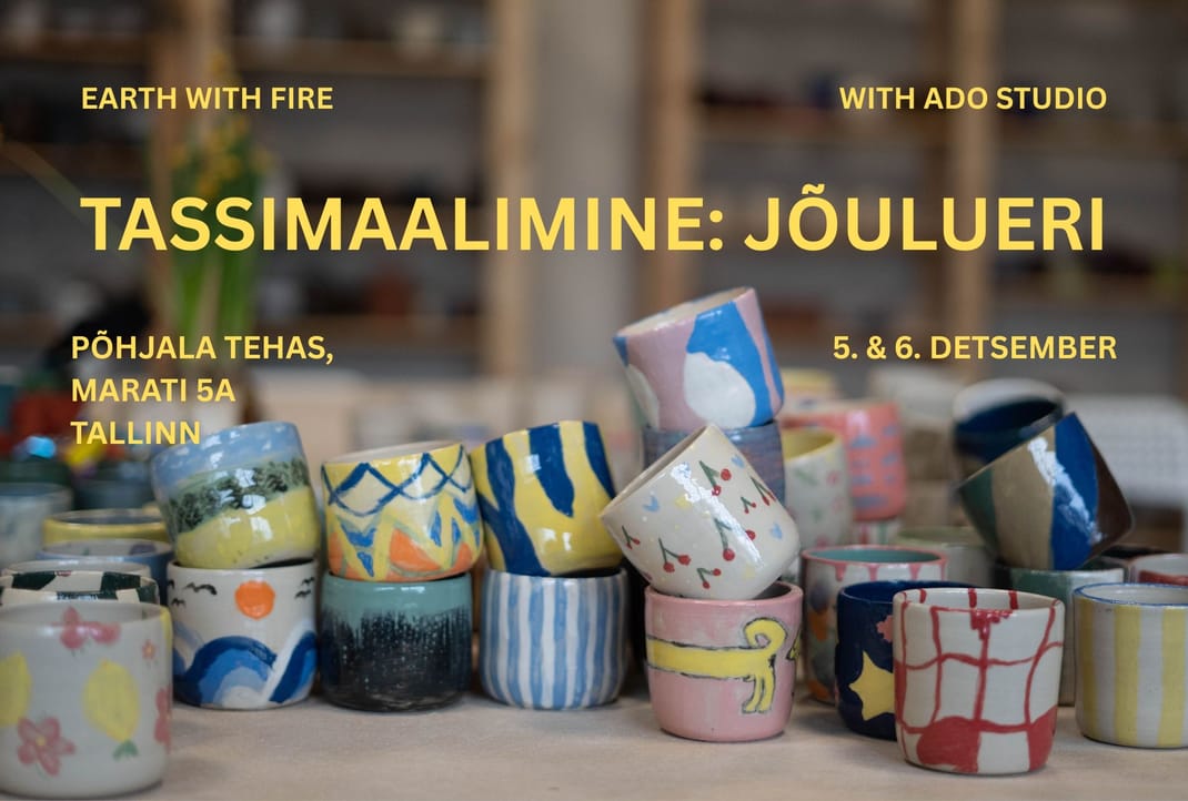 Töötoas saab ise välja valida meie poolt valmistatud tassi, maalimisega juhendavad Johanna Adojaan (ADO studio) ja Delis Piile (Earth with Fire). Valikus on lai valik erinevaid värvitoone. Peale meeleolukat töötuba lähevad teosed kuivama, kaks korda ahju ning siis saab need kenasti veel enne jõule ka valmiskujul kätte.