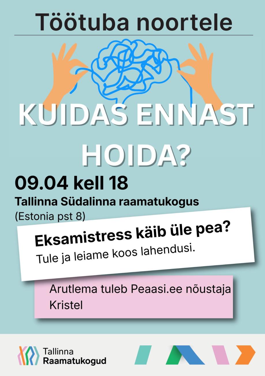 Eksamistress käib üle pea? Töötoas otsime koos lahendusi, kuidas keerulisel ajal enda eest hoolitseda ja stressiga paremini toime tulla. Erinevatest enesehoiuviisidest tuleb rääkima Peaasi.ee nõustaja Kristel. Lisaks tutvustame raamatuid, millest võib samuti leida häid nõuandeid või mis aitavad end paremini tunda.