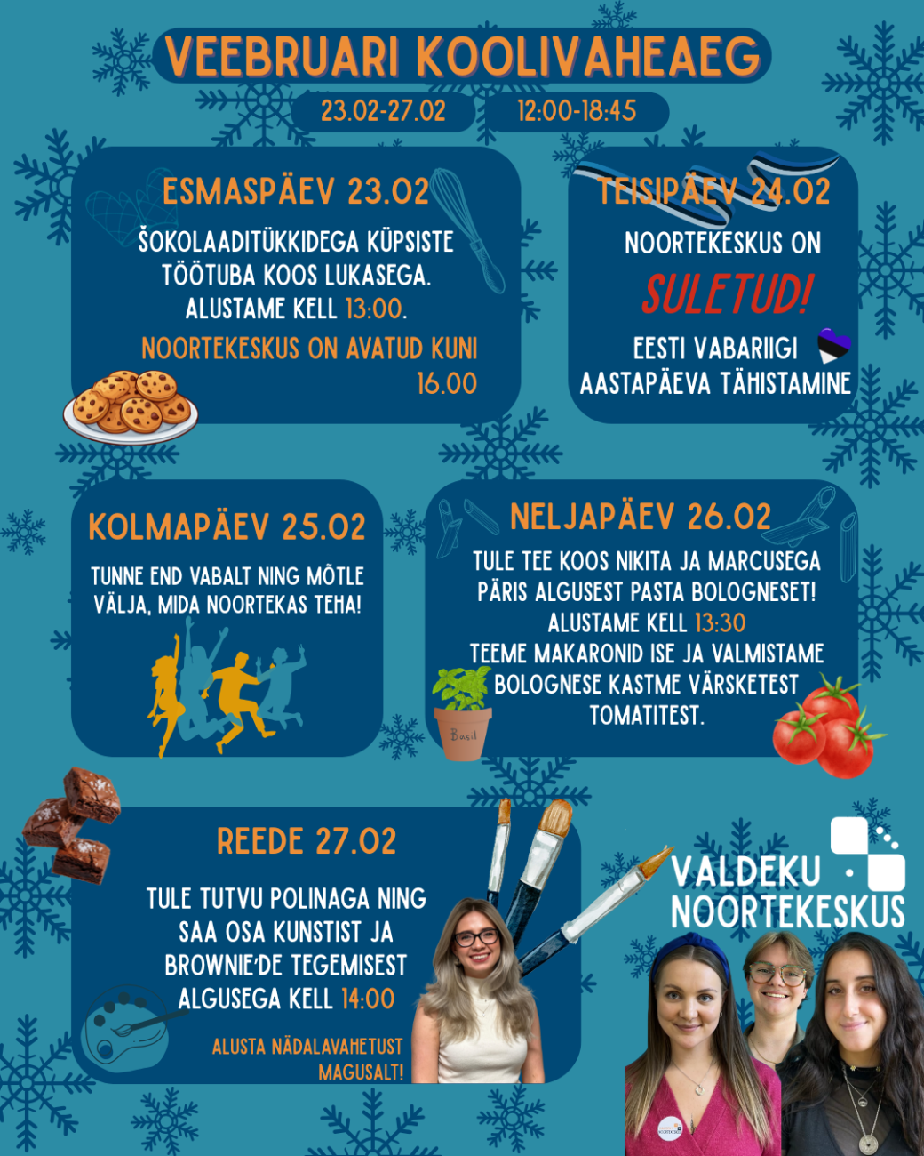 Valdeku noortekeskuse eesmärk on pakkuda noortele veebruari koolivaheajal võimalust osaleda tegevustes, mis sünnivad suuresti noorte enda algatusel. Meie nädala fookuses on kokkamine, kus noored saavad õppida uusi oskusi, tegutseda koos ja panustada ühisesse tegevusse. See on hea võimalus avastada midagi uut, olla osa kogukonnast ja teha midagi päriselt koos. Nii toetame noorte iseseisvust, koostööoskuste arengut ja julgust oma ideid ellu viia.
