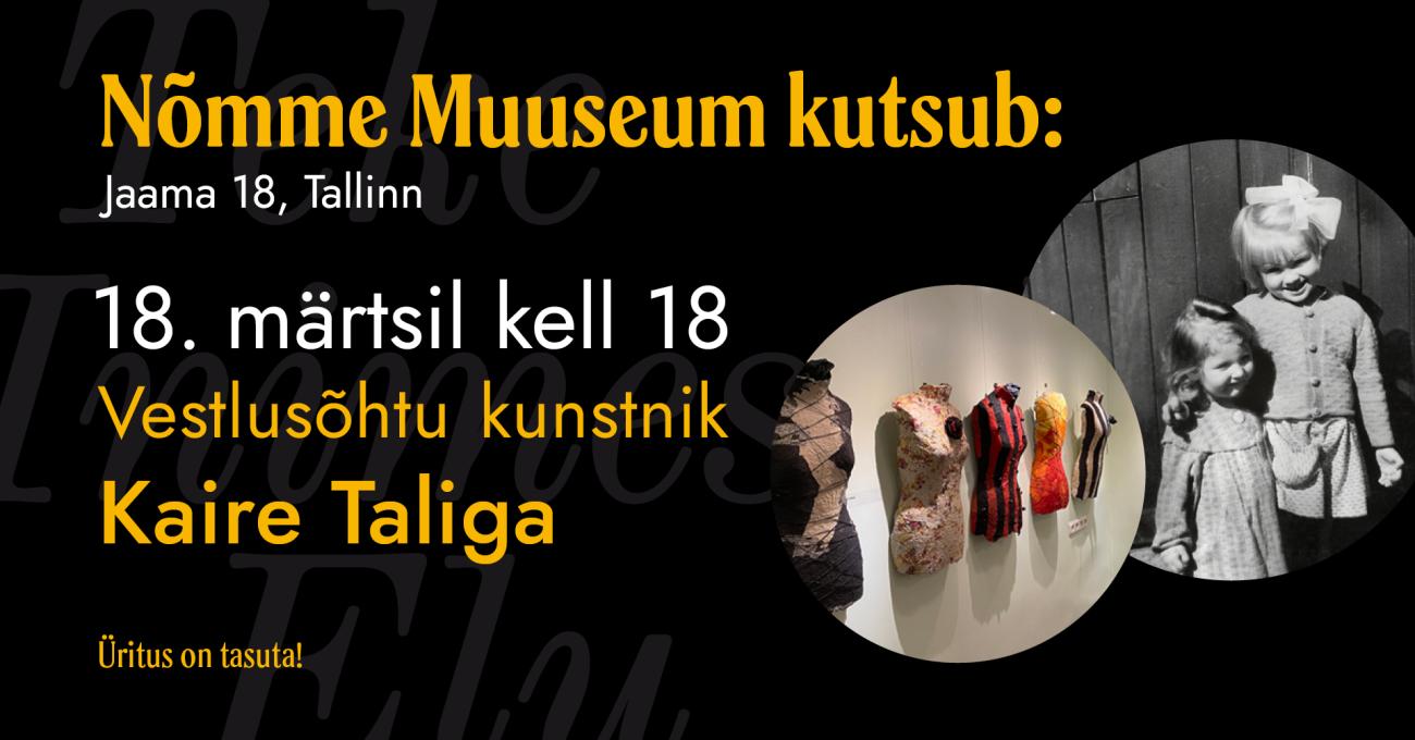 Tagasi nimekirja juurde Vestlusõhtu kunstnik Kaire Taliga Nõmme Muuseumis Haridus Koolitus/loeng Näitus/Muuseum Tasuta 18.03.2026 kell 18:00 - 19:00 Nõmme muuseum Korraldaja Nõmme Muuseum ´53883990 Kell 18 VESTLUSÕHTU kunstnik Kaire Taliga Nõmmega seotud paigad, 47 aastat tekstiilikunsti loomingut, ringkäik näitusel „Mind on mitu”. Korraldaja Nõmme Muuseum ´53883990 59.3844713, 24.699246